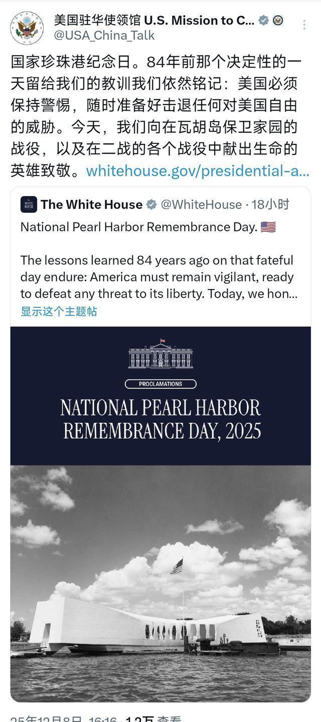 事实上,就在民主党发信前几天。 美国战争部官方账号还在X平台发文纪念珍珠港事件84周年,强调“我们永不忘”。