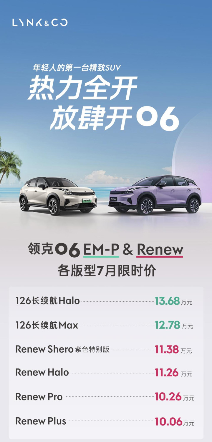 在这样优越的产品实力之外,领克06家族在7月推出了诚意满满的购车政策,进一步降低入手门槛。领克 06 EM-P 享10000元限时购车补贴、至高10000 元超享焕新补贴、至高 2000 元置换 / 增购补贴及至高 20000 元国家报废补贴,限时专享价 12.78 万起;领克 06 Renew 可获 6000 元限时购车补贴、至高10000 元超享焕新补贴、至高 2000 元置换 / 增购补贴、至高 15000 元国家报废补贴,支持 5 年贷 10 万 3 年 0 息,限时专享价 10.06 万起,对预算有限或才出入社会工作的朋友相当友好。